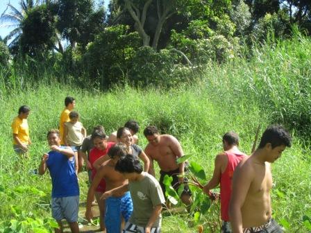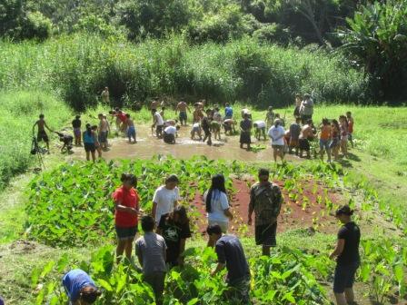 Peu à peu, les élèves prennent leurs marques, dans un premier temps en s’essayant à planter, puis dans un second temps en exécutant un hakka marquisien dans la vase. Un souvenir inoubliable !!!
